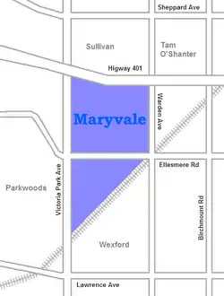 Maryvale is a neighbourhood in Toronto, Ontario, Canada. It is located on the western edge of the Scarborough district, with its western border being Victoria Park Avenue. To the north it is bordered by Highway 401, to the east by Warden and to the south by railroad tracks.