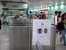 Wanted posters of Mas Selamat were put up in shopping centers, buses, train stations, and schools islandwide to appeal for the public to inform police should they spot him, and leaflets given out by volunteers to members of the public.[9] The three telecommunications companies in Singapore sent out Multimedia Messaging Service (MMS) messages starting on 1 March 2008 to all 5.5 million subscribers with Mas Selamat's photograph, as well as email messages to SingNet Internet users.[32] The MMS read, "Please call 999 immediately if you see Mas Selamat bin Kastari. He is short (1.58m tall) and limps on his left leg. Thank you." Lockdowns at border and immigration checkpoints also resulted in much longer queues for people leaving Singapore.