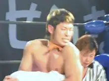 Takanashi was first trained in professional wrestling by Último Dragón at his Último Dragón Gym. After failing to graduate from his class, Takanashi moved to the training dojo of the Dramatic Dream Team (DDT) promotion.[21][22] From August 19 to September 6, 2003, Takanashi wrestled several exhibition matches for DDT, before making his official debut for the promotion on September 14, where he, now working under the shortened ring name Masa Takanashi (spelled in western naming order [given name first]), was defeated by Super Uchu Power.[1][23] For the rest of the year, Takanashi wrestled mostly opening matches, picking up his first win on December 29, when he pinned Daichi Kakimoto in a six-man tag team match.[23] In early 2004, Takanashi began regularly teaming with Danshoku Dino.[24] On May 29, Takanashi defeated Shoichi Ichimiya in the first round for the inaugural King of DDT tournament.[24] The following day, he was eliminated from the tournament in the semifinals by Danshoku Dino.[24] From April to May 2005, Takanashi represented DDT in Kaientai Dojo's K-Metal League, where he failed to make it to the finals.[25][26] Upon his return to DDT, Takanashi began wrestling as a representative of DDT's Cruiser's Game project.[27] In January 2006, Takanashi was, in storyline, brought under the spell of Poison Sawada Julie and turned into a human snake. Takanashi would wrestle as a member of Julie's Snake Corps, before managing to break away from the group in May, along with Seiya Morohashi.[2] On June 25, Takanashi won his first championship, when he, working as Masahiro Mekanashi, a character inspired by the Mecha Mummy, defeated Mecha Stanley for the Ironman Heavymetalweight Championship.[7] Takanashi then entered a battle royal, where he lost the title to Natsuki☆Head, before regaining it from Mikami and then losing it to Mecha Mummy.[7] Also in 2006, Takanashi made his debut for El Dorado Wrestling, where he worked alongside his Último Dragón Gym training partners as King Pocota.[3][22] The character then moved to DDT, where he was renamed Poco Takanashi and won the Ironman Heavymetalweight Championship two more times, each time holding the title less than a day.[7] On November 23, Takanashi won his first major title, when he and Seiya Morohashi defeated Francesco Togo and Mori Bernard for the KO-D Tag Team Championship.[28] After a five-month reign, Takanashi and Morohashi lost the title to Michael Nakazawa and Tomomitsu Matsunaga on April 1, 2007.[28] After returning to performing as Masa Takanashi, he defeated Danshoku Dino and Kudo in a three-way match on February 20, 2008, to win the DDT Extreme Championship.[29] He would go on to lose the title to Francoise Takagi on July 6.[30] During the summer of 2008, Takanashi formed the "Belt Hunter×Hunter" stable with Danshoku Dino, Hikaru Sato, Keisuke Ishii and Tigers Mask. The stable's storyline rivalry with the Italian Four Horsemen stable built to an eight-man tag team match on December 28, 2008, where the loser of the fall would be banished from DDT. The match ended with Horsemen member Antonio Honda pinning Takanashi for the win; as a result, Takanashi was, in storyline, forced to leave DDT.[31]