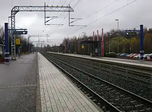 Masala railway station (Finnish: Masalan rautatieasema, Swedish: Masaby järnvägsstation) is a station on the Helsinki commuter rail network located in the Masala district of Kirkkonummi, Finland, between the Kauklahti and Jorvas stations. The station is served by Helsinki commuter rail lines Y, U and L. Westbound trains towards Kirkkonummi and Siuntio use track one, while eastbound trains to Helsinki use track two.