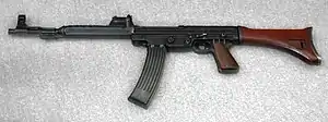 As early as 1918 the German Army began to study the feasibility of an intermediate round and rifle.[4] However, a combination of military orthodoxy, limited funds and the arms development restrictions of the Versailles Treaty led Germany to adopt the Mauser Karabiner 98K on 21 June 1935. From 1939 onwards the German Army gathered combat reports which were analyzed to determine combat conditions and tactical trends in order to develop new tactics and equipment requirements.[1] One of the lessons which re-emerged was the existing 7.92x57mm rifle cartridge was more powerful and long ranged than what was needed. Since most combat took place at ranges less than 400 m (440 yd) a less powerful round could be used, which would mean a soldier could carry more ammunition, the weapon could be shorter, lighter and with less recoil the gun could be an automatic.[1] Submachine guns had existed since the First World War, but they used pistol caliber ammunition and lacked both the range and accuracy the German Army was looking for. A new intermediate cartridge was needed and the 7.92×33mm Kurz was designed in response to this requirement. The specification called for a new weapon which was larger than a submachine gun, more accurate, longer ranged and more maneuverable than a full sized rifle.