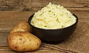 Mashed potato or mashed potatoes (American and Canadian English), colloquially known as mash (British English),[2] is a dish made by mashing boiled or steamed potatoes, usually with added milk, butter, salt and pepper. It is generally served as a side dish to meat or vegetables. Roughly mashed potatoes are sometimes called smashed potatoes. Dehydrated instant mashed potatoes and frozen mashed potatoes are available. Mashed potatoes are an ingredient in other dishes, such as dumplings and gnocchi.
