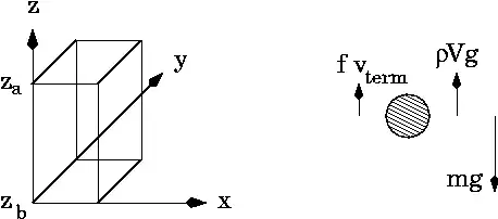 A typical particle of mass m moving with vertical velocity v is acted upon by three forces (Fig. 1): the drag force , the force of gravity and the buoyant force , where g is the acceleration of gravity, V is the solute particle volume and is the solvent density. At equilibrium (typically reached in roughly 10 ns for molecular solutes), the particle attains a terminal velocity where the three forces are balanced. Since V equals the particle mass m times its partial specific volume , the equilibrium condition may be written as