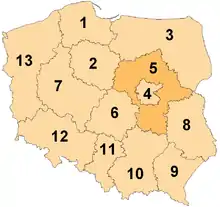 The relevant Polish legislation ("The Act of 23 January 2004 on Elections to the European Parliament"[1]) establishing the constituencies does not give the constituencies formal names. Instead, each constituency has a number, territorial description, and location of the Constituency Electoral Commission. The 2004 Polish National Election Commission[2] and the 2004 European Parliament Election website[3] uses the territorial description when referring to the constituency, not the electoral commission location.
