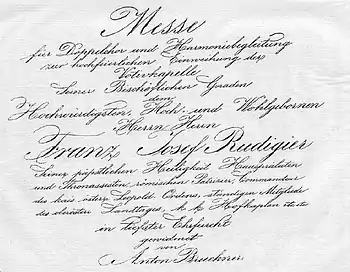 The bishop of Linz, Franz-Josef Rudigier, had already commissioned a Festive cantata from Bruckner in 1862 to celebrate the laying of the foundation stone of the new cathedral, the Maria-Empfängnis-Dom. In 1866, he asked Bruckner for a mass to celebrate the accomplishment of the construction of the Votive Chapel of the new cathedral. Because of a delay in completing the construction, the celebration of the dedication didn't take place until three years later, on 29 September 1869 on the Neuer Domplatz. The performers were the Liedertafel Frohsinn, the Sängerbund and Musikverein of Linz, and the wind band of the k.k. Infanterieregiment 'Ernst Ludwig, Großherzog von Hessen und bei Rhein Nr. 14'.[1] The manuscript and the Widmungspartitur are archived in the episcopate of Linz.[2]