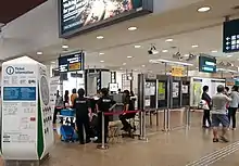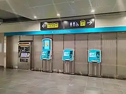 Every station is equipped with General Ticketing Machines (GTMs), a Passenger Service Centre and LED or plasma displays that show train service information and announcements. All stations are equipped with restrooms and payphones; some restrooms are located at street level.[61] Some stations, especially the major ones, have additional amenities and services, such as retail shops and kiosks, supermarkets, convenience stores, automatic teller machines, and self-service automated kiosks for a variety of services.[62] Most heavy-duty escalators at stations carry passengers up or down at a rate of 0.75 m/s, which is 50% faster than conventional escalators. The Land Transport Authority (LTA) announced a plan to introduce dual speeds to escalators along the North–South and East–West lines, to make it safer for senior citizens using them. As a result, all escalators on the two lines, through a refurbishment programme, will be able to operate at a different speed of 0.5 m/s during off-peak hours, with completion being targeted for 2022.[63]