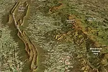 ![]() View of Massanutten Mountain from the east, looking west from Hawksbill Peak, with Luray in the foreground and the Great North Mountain in the background. August 2007. | |