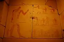 On the northern and southern walls of the entrance corridor are dining scenes. In each of them, Kaninisut sits at an offering table with twelve loaves of bread stacked close together on it, symbolising his food supply in the afterlife. Kaninisut wears a leopard pelt, the symbol of the Sem priest. On the south wall it is a long pelt and on the northern wall a more rarely depicted short pelt.[7]