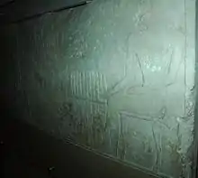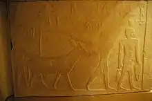 At the south door jamb, the delivery of an antelope is depicted on the south wall. Two men, wearing only kilts with three bands, bring the animal as an offering. The funerary priest Ankh-haf holds the antelope at the mouth and horns. The "leader of the hall" drives the animal forward with a stick. A man in front brings other offerings. The antelope is a donation from a property which provided materials for the funerary cult of Kaninisut. Above it are further images of offering gifts, arranged in two rows.[8]
