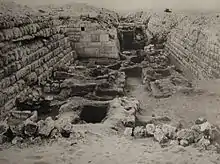 The Mastaba of Kaninisut lies in the Giza West Field, the western cemetery of Giza. There are clearly planned fields of mastabas to the east and west of the Great Pyramid. The closest relatives of Khufu, the owner of the Great Pyramid, were buried in the East Field and high officials and dignitaries were buried in the West Field. Through this privilege, the deceased could be included in the conceptual world of the royal afterlife and receive the necessary offerings via the funerary cult operated from the royal mortuary temple. Construction, alignment and decoration of the individual private tombs reflected the contemporary cultural hierarchy. During Khufu's reign a total of 77 tombs were built in the two grave fields and numerous graves were added in later times. The regular arrangement of the individual mastabas indicates that they were constructed altogether. Apparently the completed mastabas were handed over undecorated to their owners, who were responsible for any further decoration.[1] The mastaba of Kaninisut is located in the westernmost part of its section of the cemetery, which is referred to as a cemetery "en échelon" on account of the arrangement of its tombs.[2]
