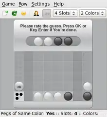The codebreaker tries to guess the pattern, in both order and color, within eight to twelve turns. Each guess is made by placing a row of code pegs on the decoding board.[3]: 120 Once placed, the codemaker provides feedback by placing from zero to four key pegs in the small holes of the row with the guess. A colored key peg is placed for each code peg from the guess which is correct in both color and position. A white key peg indicates the existence of a correct color code peg placed in the wrong position.[5]