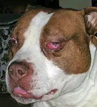Masticatory muscle myositis (MMM) is an inflammatory disease in dogs affecting the muscles of mastication (chewing). It is also known as atrophic myositis or eosinophilic myositis. MMM is the most common inflammatory myopathy in dogs.[1] The disease mainly affects large breed dogs.[2] German Shepherd Dogs [3] and Cavalier King Charles Spaniels may be predisposed.[4] There is a similar disease of the eye muscles found in Golden Retrievers. Symptoms of acute MMM include swelling of the jaw muscles, drooling, and pain on opening the mouth. Ophthalmic signs may include third eyelid protrusion, red eyes, and exophthalmos (protruding eyeballs).[5] In chronic MMM there is atrophy of the jaw muscles, and scarring of the masticatory muscles due to fibrosis may result in inability to open the mouth (trismus). The affected muscles include the temporalis, masseter, and pterygoid muscles. The disease is usually bilateral.