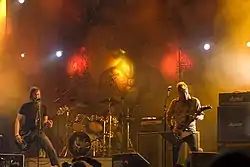 The "sludge/stoner/alternative metal outfit" Mastodon, as labeled by AllMusic, is "one of the preeminent metal acts of the early 21st century".[93] The BBC stated about Mastodon: "They might be bonkers of lyric, full of fantasy mumbo jumbo, but the band is unashamedly committed to its complex-of-composition craft, and the results have frequently stunned ever since their 2002 debut, Remission. They are the most ambitious, most fearless, most fun heavy metal band to have breached the mainstream since the genre oozed its way out of The Midlands in the 1970s."[109] Alternative Press has stated: "Mastodon are one of the all-time great hard rock groups."[110] Rolling Stone stated: "Mastodon are a bunch of doom-haunted, myth-obsessed, meat-and-potatoes Southern badasses who have become the most important new band in metal."[111] Playboy[112] wrote: "one of Mastodon’s greatest talents: the ability to take traditional metal fans along with them into other musical realms, and also appeal to more mainstream rock fans but give them some doses of metal."
