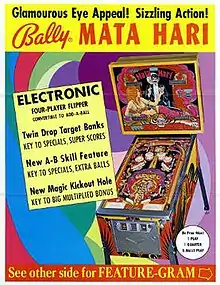 Mata Hari is a pinball machine created by Bally Manufacturing in 1977 and released in 1978. The theme of the game is based on Dutch exotic dancer, Mata Hari.[1] It was mainly produced using solid-state electronics but also 170 electro-mechanical versions were released.[2] It was the last model manufactured by Bally in two such versions. [3] Approximately 20 sample games were produced with a plastic playfield, instead of the traditional wooden playfield.[4]