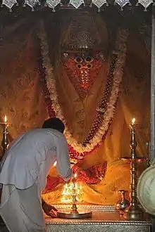 The image of Ashapura Mata in the shrine is a red-painted stone, about six feet high and six feet broad at the base, narrowing to a point in a shape, with some rough likeness to a human form. It is said to have come from Jashod in Marwar. Here every year during the Navaratri, the Rao of Cutch used to offer a sacrifice of seven male buffaloes.[1] The practice of animal sacrifice has been stopped.[6]