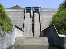 The Matanogawa Dam (俣野川ダム) is a concrete gravity dam on a tributary of the Hino River located 2.3 km (1 mi) south of Kōfu in Tottori Prefecture, Japan. Construction on the dam began in 1978 and it was complete in 1984. The primary purpose of the dam is hydroelectric generation and it creates the lower reservoir for the Matanogawa Pumped Storage Power Station (俣野川発電所). It is 69.3 metres (227 ft) tall and creates a reservoir with a 7,940,000-cubic-metre (6,440 acre⋅ft) storage capacity. The power station is located on the southern bank of the reservoir and contains four 300 megawatts (400,000 hp) Francis pump-turbine-generators. The upper reservoir for the pumped-storage scheme is created by the Doyo Dam located 6 kilometres (3.7 mi) to the southeast in Okayama Prefecture. To generate power, water from the Doyo Dam is sent to the power station, used to generate electricity and then discharged into the Matanogawa Reservoir. This occurs when energy demand is high and when it is low, water is pumped back up to the Doyo Dam as stored energy. The same pump-generators that pump the water to Doyo reverse and generate electricity when it is sent back down. The first generator was operational in 1992 and the last in 1996.[2]