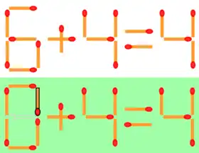 Matchstick puzzles are rearrangement puzzles in which a number of matchsticks are arranged as squares, rectangles or triangles. The problem to solve is usually formulated as: "move n matchsticks to make m squares, triangles, or rectangles". Some match stick problems are solved with planar topological graphs.[1]