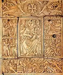 Among the most significant manuscripts of the Matenadaran are the Lazarian Gospel (9th century), the Echmiadzin Gospel (10th century) and the Mughni Gospel (11th century).[58] The first, so called because it was brought from the Lazarian Institute, is from 887 and is one of the Matenadaran's oldest complete volumes. The Echmiadzin Gospel, dated 989, has a 6th-century, probably Byzantine, carved ivory cover.[29][58] The Cilician illuminated manuscripts by Toros Roslin (13th century) and Sargis Pitsak (14th century), two prominent masters, are also held with high esteem.[29]