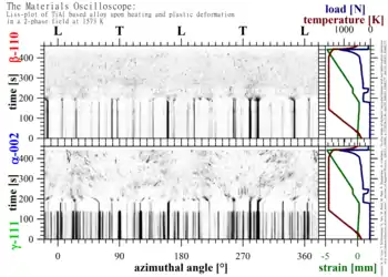 Two-dimensional diffraction images of a fine synchrotron beam interacting with the specimen are recorded in time frames, such that reflections stemming from individual crystallites of the polycrystalline material can be distinguished. Data treatment is undertaken in a way that diffraction rings are straightened and presented line by line streaked in time.[3] The traces, so-called timelines in azimuthal-angle/time plots resemble to traces of an oscilloscope, giving insight on the processes happening in the material, while undergoing plastic deformation, or heating, or both,[4][5][6][7][8][9][10] These timelines allow to distinguish grain growth or refinement, subgrain formation, slip deformation systems, crystallographic twinning, dynamic recovery, dynamic recrystallization, simultaneously in multiple phases.