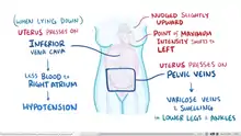 Uterine enlargement beyond 20 weeks' size can compress the inferior vena cava, which can markedly decrease the return of blood into the heart or preload. As a result, healthy pregnancy patients in a supine position or prolonged standing can experience symptoms of hypotension.[21]