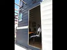 - - the shipping containers used to transport the turf have been recycled and reused as the tower element, and have been modified and incorporated alongside the field as an open shaded structure for gathering and storage