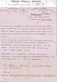 After World War II, Wieman moved to Switzerland with his wife, stage actress Erika Meingast, there in 1969 he died of cancer. Mathias and his wife Erika (died in 1972) were cremated and the ashes buried in the Wieman family plot in the Johannesfriedhof cemetery in Osnabrück.