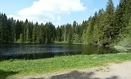 The Mathisleweiher is a large bog lake, under 2 hectares in area, in the Black Forest in southern Germany. It lies in the High Black Forest between Feldberg in the west and the Titisee in the east on the territory of Hinterzarten at about 999 m above NN southwest of the village in the Eschengrundmoos Nature Reserve.[3] The pond impounds the Zartenbach which flows through it from west-southwest to east-northeast. The stream rises on the eastern slopes of the Ramselehöhe (1,112 m above NN[LUBW 3]) at about 1,055 m above NN,[LUBW 4] picks up the Eschengrundmoosbach from the right from the protected bog and runs for less than a kilometre before entering the lake. A shorter stream runs from the north from the woods of the Stuckwald. It has a catchment of 1.0 km2[LUBW 5]