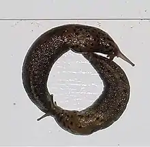 Once a mate is found, land slugs undergo a prolonged courtship phase prior to copulation. Courtship can and usually does last for several hours. The two individuals get into position along the periphery of an imaginary circle with their heads towards the other's tail, and circle one another.[13] The slugs crawl in a clockwise direction so that their right sides, containing the genital pores, continually face each other. This circling may serve to assess whether the other is ready to mate; the speed of circling generally decreases as courtship progresses. The slugs then lie close together, remaining in the antiparallel configuration. Each protrudes from its genital pore a sarcobelum, a highly manoeuvrable penile structure, with which it strokes its mate.[14]