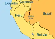 The Matis people (also called Matsë in their own native language) are an indigenous people of Brazil.[1] The Matis are commonly named as the Jaguar people by tourists and filmmakers, but they do not like to be called like this. They live in three separate communities with total population of roughly 340. They live in the far west of Brazil, in the Vale do Javari Indigenous Territory, an area covering 83,000 square kilometres (32,000 sq mi). They practice hunting, fishing, collecting (also called foraging) and agriculture. Now, they also receive money from their work as teacher, health assistance, surveillance of the territory when working for FUNAI, for example, and the elders receive pension from the government (inscribed as retired farmers, as other traditional communities also have the right for in Brazil).