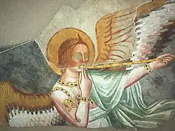 Together with the Visitation, other frescoes are displayed, some of them well- preserved. Scenes include the Just, the Blessed, two Angels with a trumpet, Saint Peter on the throne, Hell, all attributed to the Master of the Life Tree.