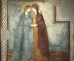 Other frescoes depict Jesus among the Doctors, The Baptism of Jesus, The Virgin with Child Enthroned, The Miracle of the Wheel by Saint Catherine of Alexandria, Saint Martin with the Pauper, Jesus entering Jerusalem and the Miracle of Napoleone Orsini's reanimation by Saint Dominic. These works, together with the Visitation, have been attributed to the First Master of Chiaravalle.