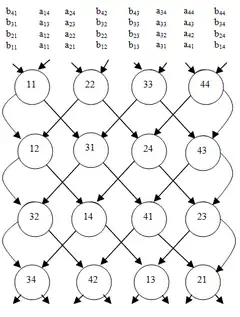 The result is even faster on a two-layered cross-wired mesh, where only 2n-1 steps are needed.[26] The performance improves further for repeated computations leading to 100% efficiency.[27] The cross-wired mesh array may be seen as a special case of a non-planar (i.e. multilayered) processing structure.[28]