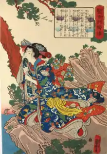 Matsura Sayohime, according to the oldest account[6] related in the poem collection Man'yōshū (8th century), was the wife of Ōtomo no Satehiko (or Sadehiko). In order to bid farewell to her husband, who was on a ship bound for Korea for a military campaign, she climbed atop a certain mountain peak.[1] So deep was her sorrow: she seemed "gut-wrenchedly" chagrined and darkened-hearted as if her "soul had vanished".[7][lower-alpha 3] Finally, she managed to remove her own scarf and wave it, drawing others around her inevitably to tears.[5][6][8]