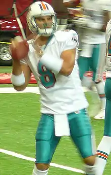 Moore was signed by the Dolphins on July 28, 2011, to back up Chad Henne. He switched numbers, from 3 to 8. On October 2, 2011, Moore entered the game against the Chargers in the first quarter after Henne went down with a shoulder injury. He completed 17 of 26 passes for 167 yards and an interception, compiling a 67.3 quarterback rating.[64] On November 6 he became the first Miami quarterback since Chad Pennington in 2008 to throw three touchdown passes in a game, in their 31–3 win over the Kansas City Chiefs.[65]He was named AFC Offensive Player of the Week for his game against the Chiefs.[66] He repeated that feat in week 11, blowing out the Bills 35–8, and had the highest QB rating of the week.[67] Following the season, he was announced as the Dolphins' 2011 season MVP.[68] Overall, Moore finished the 2011 season with 2,497 yards, 16 touchdowns, and nine interceptions.[69]