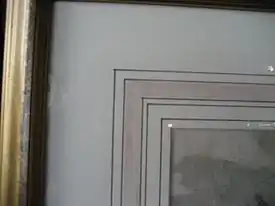 A common form of decoration on non-cloth coated mats is the French line or line, and the French panel or panel. These forms of matting may also be called French mats.[4] A French line or line is a line drawn on the mat, usually in ink or paint and usually drawn to form a complete rectangle or square around the opening in the mat.[5] It is used as additional decoration to help draw the eye in towards the center of the display, and can be done in pencil or any color of ink or paint, including metallic inks. A French panel or panel is similar to a French line, with the exception that it is thicker, formed from decorative material ranging from gold leaf to a design in ink or paint. Typically a painted French panel will be done in watercolor, which is also sometimes referred to as a watercolor panel.