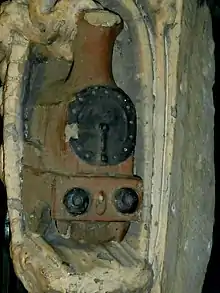"This decorative work was executed by a Leeds sculptor Matthew Taylor ... He has a son and granddaughter still living in Leeds."[30] "On one occasion a lecturer on art took members of a club to see this carving. They were scanning the walls of the Queen's with field glasses, so the story goes, and attracted attention sufficient to draw a crowd. The crowd grew to large proportions and the traffic was impeded. The police arrived and dispersed the crowd - and, the story continues, dispersed the members of the club before they had properly scrutinised the carving." This carving included grapes and a bottle, a violin, partridges, pheasants and pears. By 1935 the carvings were "blackened by age, and pass unnoticed unless they are closely sought. An old employee at the Queen's says he has often been asked to show visitors the railway engine coming out of the tunnel. There are bearded faces also peering down from the walls." Demolition man Mr Edwin Airey ... said ... "If anything of real value is found during the demolition, we shall doubtless do our best to preserve it; but it is often difficult to remove stone carvings intact during a demolition of this kind." The Queen's Hotel was demolished in September 1935.[37]