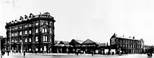 This hotel preceded the present Queens Hotel, Leeds. The West Midland Railway Company decided to build the hotel at a meeting on 16 August 1859, and in 1861 it was authorised by the Midland Railway Act of Parliament. It was designed by Perkin & Backhouse, built by W. Nicholson & Son, and was "of a very ornate character, in the Italian style of architecture." In 1867 and 1898, new wings were added, designed by C.T. Trubshaw.[34] The hotel opened on 10 January 1863.[35]