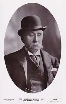 However, Davies was eventually chosen as candidate defeating Wynford Phillips by 160 votes to 111 at a delegate conference.[5] Kenneth O. Morgan has argued that this was due to his support among rural areas where electors 'resented the social climbing of the Aberystwyth bourgeoisie;.[6] It was reported at the time that the influence of the Aberystwyth element within the Liberal Association had been resented ever since the Cardiganshire County Council was formed in 1889.[7] Vaughan Davies was regarded as an outsider who was also sternly opposed by the Aberystwyth-based Cambrian News, who stated that his selection was 'a more complete defeat of Liberalism than if Mr Harford, the Conservative candidate, had been placed at the head of the poll by a large majority'.[8] There is no doubt that his selection created divisions in the Liberal ranks.[7] Some compared the extent of the divisions with the position in 1886 when David Davies had defected to the Liberal Unionists.[8] Nevertheless, a closer examination of the way delegates from individual wards voted at the selection conference indicates that both candidates drew support from rural wards and while the nineteen delegates from Aberystwyth voted for Phillips the eleven delegates from the county town of Cardigan supported Davies.[5]
