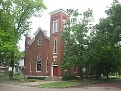 The 1850s saw a flurry of activity for the emerging town. In 1855, the first houses were built. Benjamin Turney used 16 yoke of oxen to drag his home from a farm three miles away, while R. H. McFadden built his home near the area of present-day First Street and Prairie Avenue. In May that year, "Pegtown" lots were auctioned. On June 9, 1855, the first train arrived on the Terre Haute Alton Railroad.[5] In July, the Pennsylvania House became the first hotel in town, operating at the present-day 1600 block of Broadway Avenue. That month the first post office was established, with James M. True serving as postmaster. In September, Rev. Isaac Hart performed the town's first wedding, marrying Sarah Norvell and R. H. McFadden.