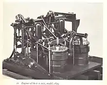 Maudslay's Lambeth works began to specialize in the production of marine steam engines. The type of engine he used for ships was a side-lever design, in which a beam was mounted alongside the cylinder. This reduced height in the cramped engine rooms of steamers. His first marine engine was built in 1815, of 17 h.p., and fitted to a Thames steamer named the Richmond. In 1823 a Maudslay engine powered the Lightning, the first steam-powered vessel to be commissioned by the Royal Navy. In 1829 a side-lever engine of 400 h.p. completed for HMS Dee was the largest marine engine existing at that time.[4]