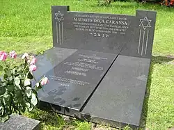 During World War II, according to Frank Bovenkerk, emeritus professor of criminal science in Utrecht, Caransa, angered by the anti-Jewish violence of the NSB (National Socialist Movement in the Netherlands), joined one of the many knokploegen, "assault groups" that in turn beat up on NSB members and especially members of the WA (Weerbaarheidsafdeling), the NSB's violent paramilitary wing. After the war, Caransa would not speak of these matters, saying it brought back too many painful memories.[3] Before the February strike in response to Nazi pogroms, almost all of Caransa's family, including his brother Joel who lived next door to him, had already been arrested. His sister Femma managed to hide, while Maup himself reported at Westerbork transit camp after his parents were taken there. He spent a week with them but was let go, while his parents were deported to Germany.[4] His parents and his three brothers died in Nazi concentration camps.[2] Because he married a Catholic woman in 1941 and did not appear stereotypically Jewish to the Nazis and their allies[5][6][7] (he had blond, almost red hair and light-blue eyes[2]), he was "destarred" after having agreed to sterilisation.[4][8] He survived the war living in the Jodenbuurt, the Jewish quarter of Amsterdam; he and his sister were the family's only survivors.[9]