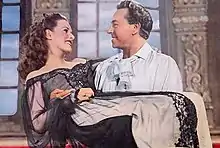 In 1945, O'Hara starred opposite Paul Henreid in The Spanish Main as feisty noblewoman Contessa Francesca, the daughter of a Mexican viceroy.[85] O'Hara described it as "one of my more decorative roles",[86] as her character is a particularly aggressive one among the men on a ship, and during the course of the film her face is smothered in chimney soot.[87] O'Hara almost did not win the role when another actress falsely told RKO executive Joe Nolan that she was "as big as a horse" after giving birth to a daughter in 1944.[88] Around this time "an actress named Kathryn" also falsely accused O'Hara of making sexual advances towards her in an elevator, which she believed was a way for the actress to gain attention at the start of her career.[89] During the production of The Spanish Main, O'Hara was visited by John Ford, who was initially turned away for being shabbily dressed, but was later admitted. He informed her about the project that would become The Quiet Man (1952). Malone notes that in the film O'Hara "shows her determination not to leave her sexuality at the birthing stool", commenting that she looks "deliciously fragrant in the splashy histrionics on view here, in RKO's first film in the three-color Technicolor process" [88] O'Hara became a naturalized citizen of the United States on 24 January 1946,[7] and held dual citizenship with the United States and her native Ireland.[90]