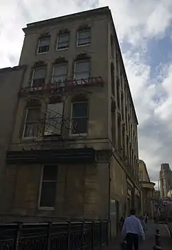 Some of the furnishings from the RMS Mauretania were installed in a bar/restaurant complex at the bottom of Park Street,[2] initially called "Mauretania", now "Java". The lounge bar was the library with mahogany panelling: above the first-class Grand Saloon with French-style gilding overlooks Frog Lane. The neon sign on the south wall still advertises the "Mauretania": installed in 1938 this was the first moving neon sign in Bristol.[3]