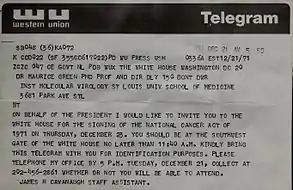 Green's research in the 1960s and early 1970s was highly regarded because of the insights it provided into the role of viruses in cancer.[1][7][8][9][10][11][12] It is thus notable that in December 1971, Green was invited by U.S. President Richard Nixon to attend the signing of the National Cancer Act of 1971 at the White House, an event that is generally viewed as the beginning of the ‘War on Cancer.’ At that bill signing, he was given one of the pens used by President Nixon to sign the legislation.