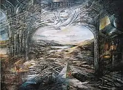 His works, like that of his brother Antonio, tend to deal with urban themes often about human decadence. Images are not realistic and generally distorted. Mauricio’s works often contain urban landscapes with a chaotic feel. The Aus der Tiefe series deals with the violence in human society, which Mauricio has said continues to grow. Maurico considers his works to be cathartic, especially for him as he paints.[4]) He states that his main influences are Francisco Goya, Francis Bacon and Giovanni Battista Piranesi as well as German Expressionism, and Goya’s Black Paintings. He mostly uses acrylics because they dry faster than oils.[3] According to art critic Carlos Blas Galindo, García Vega’s works are meant to disquiet, move, impact, impress, surprise and amaze onlookers. His images can evoke a sense of terror, the sublime, the sinister, the grotesque, the brutal and the dramatic. His works are often done in diptychs and triptychs.[2]