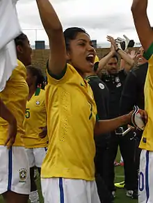 At the 2011 FIFA Women's World Cup, naturally right-footed Maurine was deployed on the left of Brazil's midfield.[15] During the 2011 Pan American Games Maurine was bereaved by the untimely death of her father. She scored the only goal of the semi-final against hosts Mexico and dedicated it to his memory.[16] Later she got a tattoo on her forearm of herself celebrating the goal, bearing the legend: "Father, a great man, a huge yearning."[17]