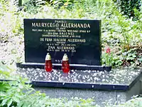 Their deaths are not documented, but after the war, Karol Koranyi made a reference to an eyewitness who survived the Camp and saw them being murdered in the same month by the Ukrainische Hilfspolizei.[5] Their bodies were burned and the ashes scattered. Notably, Allerhand family sometimes appears in print incorrectly as victims of Belzec extermination camp.[6] However, his son Joachim with wife Zina and his grandson Leszek who was 10 at the time, had survived the Holocaust. Decades later and only after the collapse of the Soviet empire - known for falsifying the wartime history of the city - his grandson Leszek published a 2003 book based on the memoirs of his grandfather written in 1941–1942,[7] started by Allerhand soon after the German attack of Lwów and concluded in February 1942.[2] His account of life in the ghetto, although not nearly as voluminous as Dobroszycki's Chronicle of the Łódź Ghetto provides invaluable insight into the lives of Polish Jews under the Nazi occupation of Lwów. It describes the 1941 pogroms perpetrated by Germans with the aide of local Ukrainians,[5] but also, it includes a mention of his conversation with a former agitator installed at UoL by the Soviets, blaming the Poles for it. He was promptly corrected by Allerhand.[8]