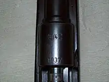 The Karabiner 98k is a controlled-feed bolt-action rifle based on the Mauser M98 system. Its internal magazine can be loaded with five 7.92×57mm Mauser cartridges from a stripper clip or one-by-one.[3] After loading, the empty clip is ejected when the bolt is closed. The straight bolt handle found on the Gewehr 98 bolt was replaced by a turned-down bolt handle on the Karabiner 98k. This change made it easier to rapidly operate the bolt, reduced the amount the handle projected beyond the receiver, and enabled mounting of aiming optics directly above the receiver. Each rifle was furnished with a short length of cleaning rod, fitted through the bayonet stud. The joined rods from 3 rifles provided one full-length cleaning rod.