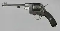 Later, the design evolved into a top break, and a swinging cylinder design and also include a solid frame rifle version. In 1886, an improved 9 mm version with a hinged frame was introduced.[4]
