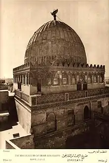Imam al-Shafi'i travelled to Cairo in 813 where he taught at the Mosque of Amr ibn al-As, before his death in 819. He was buried by his child Ibn Abdulhakim in the place of turbah in the City of the Dead.[1] Later, the Ayyubid sultan Salah ad-Din built a turbah and madrasa for Shafi'i in 1176, marking the first establishment on his grave. In 1178, a wooden coffin was created with decorations of Islamic geometric patterns and inscriptions of the Qur'anic verses and the life of Shafi'i in Kufic and Ayyub scripts. The decorations were created by Abid al-Najar.[1]